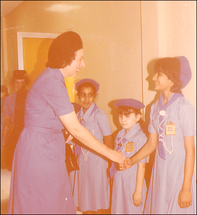 "منذ الصغر بمدرستي في القاهرة كنت عضواً فاعلاً في الفرق الكشفية بدءًا بـ(الزهرات) إلى (المرشدات) وكنا نتلقى ضمن البرامج الكشفية تدريبات مكثفة على الإسعافات الأولية التي لم نكن نتوقع آنذاك أننا سنحتاج إلى ممارستها في الحياة. ولكن الشدائد علمتنا متى يكون وقت توظيف هذا التأهيل الذي حصلنا عليه، فعندما واجهت القاهرة ظروف الحرب وجدنا أننا تلقائياً قد تحولنا إلى جنود مؤهلة لخدمة المجتمع في الظروف الطارئة".