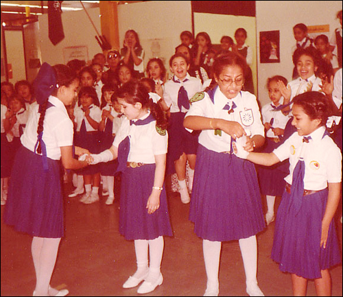 المرشدات بصوت واحد (والأصابع الثلاث لليد اليمنى مرفوعة تذكيراً بالعهود الثلاثة التي يتضمنها ميثاق المرشدة واليد مرفوعة بمحاذاة الكتف تقريباً):