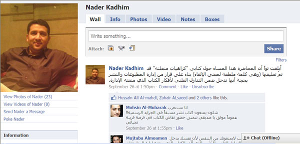 منعت الرقابة في مملكة البحرين مؤخراً توزيع كتاب "كراهيات منفلته" للإكاديمي الناقد البحريني نادر كاظم. وتشير التفاصيل إلى أن إدارة المطبوعات والنشر في هيئة شؤون الإعلام البحرينية منعت توزيع الكتاب بعيد وصوله بالشحن من "الدار العربية للعلوم" ببيروت عشية "مهرجان الأيام للكتاب 18 "، والذي تقيمه صحيفة الأيام البحرينية واستمر من 23 من سبتمبر/أيلول الماضي إلى الثالث من اكتوبر/ تشرين الأول الجاري.
