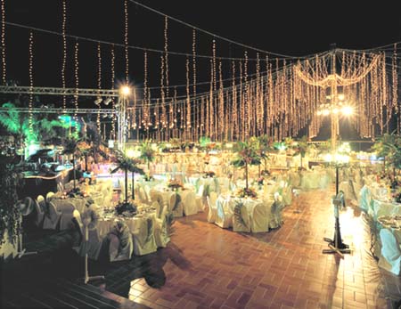تتجه أغلب الأعراس في الوقت الحالي للإحتفال في قاعات مفتوحة خاصة عندما يكون الطقس معتدلاً والأجواء جميلة وهذا الإختيار يمنح مصمم الديكور مساحة كبيرة للإبداع بلا حدود. نلاحظ في هذه الصورة الفكرة المبتكرة بإستخدام الأضواء الصغيرة المنسدلة من الأعلى.