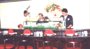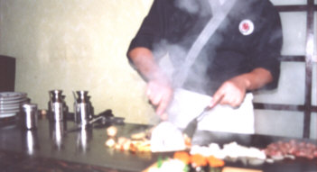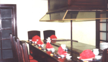 أما طاولة الطعام فهي عبارة عن أفران خاصة مثبتة في الأرض ليبدأ أمامك طهي الطعام واستعراض مهارة الطاهي الياباني الذي يمارس حركات فنية مثيرة أثناء الطهي... ويبرز مرة أخرى اللون الأحمر في المقاعد ولعل هنا نظرية علماء النفس تتحقق باعتقادهم أن اللون الأحمر هو الاختيار الأنسب للمطاعم لأنه يساعد على زيادة شهيتك للطعام.
