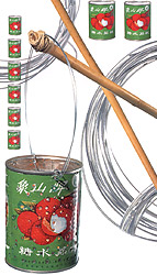 علبة ملونة فارغة للخضار أو الصلصة ، عصا من خشب البامبو، سلك معدني، خيوط.