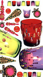 مجموعة من الأكواب الزجاجية الصغيرة الملونة على أن تكون نصف شفافة، و تشكيلة مختارة من صور (البندي) الهندية.