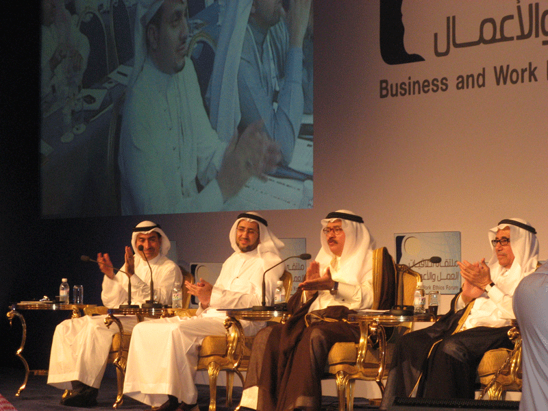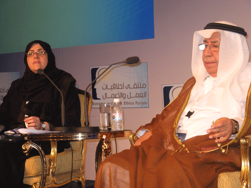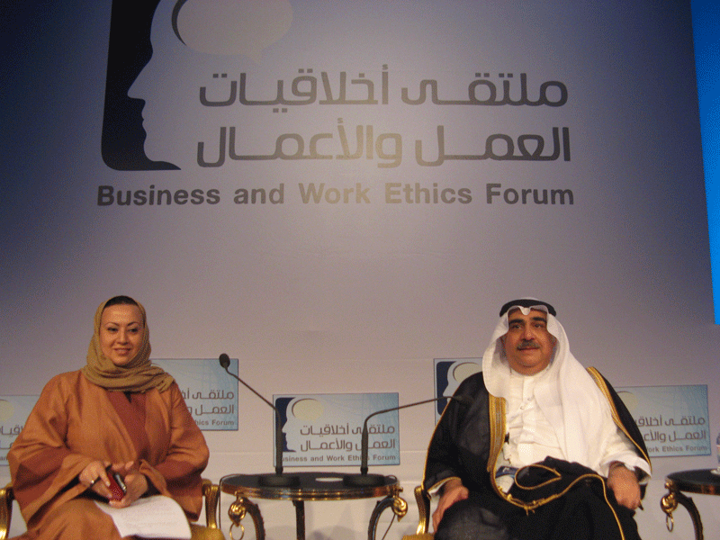 وجاءت جلسة الافتتاحية تحت رئاسة الدكتورة بسمة العمير الرئيس التنفيذي لمركز السيدة خديجة بنت خويلد الغرفة الصناعية التجارية بجدة تحت عنوان (المسؤولية الأخلاقية من منظور قيادي وخلقي)بحضور معالي وزير العمل المهندس عادل فقيه حيث عزز معالي الوزير"ميثاق وزارة العمل كونه نموذجا لمؤسسة من مؤسسات القطاع العام والذي تم تقديمه بعد إعداده من وزارة العمل تحت مسمى "مبادئ ميثاق" بين الوزارة ومنسوبيها والمستفيدين منها ومن خدماتها".