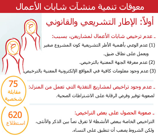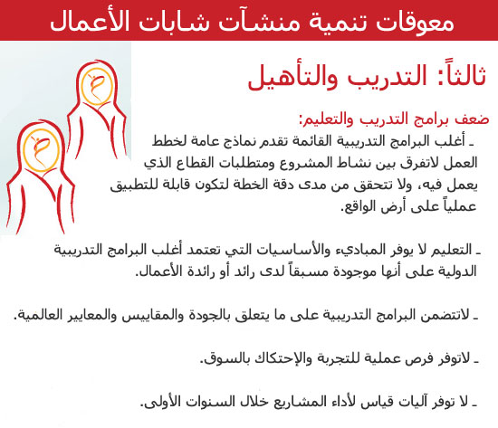ومن خلال 300 مشروع شاركت في المسابقة و25 مشروع خضع للتدريب و7 مشاريع فائزة بتمويل غير مسترد وإرشاد لمدة عام، بالإضافة للمشاريع المستفيدة من الفرص الاستثمارية والتجارية والعقود التجارية، وعدد من استطلاعات الرأي للشريحة المستهدفة، رصد التقرير أهم معوقات تنمية منشآت شابات الأعمال، واعتبر التجربة التي تم تطبيقها للمرة الأولى خلال اللقاء نموذجاً حياً للشراكات بين القطاع الخاص والعام لدعم شباب وشابات الأعمال.