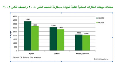 حدثت انخفاضات طفيفة في أسواق المبيعات السكنية خلال عام 2009 بالمقارنة مع عام 2008 على نطاق واسع في حدود 10 ٪ إلى 20 ٪ في المراكز الرئيسية الثلاثة وهي الرياض، جدة، لخبر والدمام. وحدث الانخفاض الأكبر في الأسعار (حوالي 20 ٪) في الرياض، و كانت الانخفاضات أكثر تواضعاً في المنطقة الشرقية وجدة. ولم تؤثر الزيادة الكبيرة في مشاريع التطوير العقاري في المنطقة الشرقية التي صاحبت ازدهار قطاع النفط في السنوات الأخيرة حتى الآن على طلب المساحات السكنية ولا يزال الإشغال في جميع القطاعات ولا سيما المجمعات السكنية (الكمباوند) مرتفعاً للغاية.