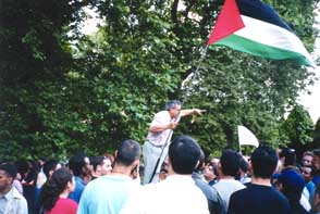 ويرتفع صوت من الجمهور يصرخ في الخطيب :" هل يمكنك أن تزيل علم فلسطين لأنه يسيء لها بحديثك عنها فأنت لا تدرك ما تقول!!!"....ينزعج الخطيب ويرتفع صوته أكثر وهو يجيب على هذا الشخص قائلاً :" بالطبع أنت تقول ذلك لأنك لا تحمل همومك العربية وأنت من لايعرف شيء عن نصرة القضية الفلسطينية و....." إلى هنا وانسحبنا نحن أيضاً إلى منبر آخر....