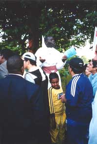 هنا خطيب افريقي مسلم يرفع علم ( لا إله إلا الله محمداً رسول الله ) ويتحدث باللغة الإنجليزية عن عظمة الإسلام وعدم تفريقه بين الشعوب من حيث اللون والعرقية... ويطالب بتغيير نظرة القومية العربية التي جعلت من الإسلام كأنه حكراً على العرب فنبذوا شعوباً كثيرة مسلمة يمكنها أن تدعم القضايا الإسلامية بقوة ... ودعا الخطيب إلى الوحدة الإسلامية بغض النظر عن الجنسية واللون والإنتماء لتزداد قوة الإسلام ويتحقق تحرير القدس من أيدي اليهود... أما الجمهور الملتف حوله فكان يتراوح بين الأفارقة الذين يقدمون له التشجيع ، والأجانب الذين انفضوا سريعاً ... وبعض العرب الذين يتنقلون لسماع مقتطفات من هنا وهناك.