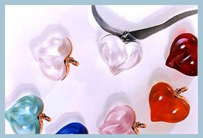 دلايات على شكل قلوب رقيقة من ( لاليك ) بألوان متعددة من الكريستال مع سلسال من الساتان الأسود.