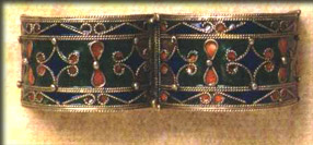 أساور الأمازيغ تنضح بعبق الماضي ونبض الحاضر، لا تملك إلا أن تقف مبهورا أمام روعة التصميمات ودفئ الألوان وتناغم التفصيلات، فيغمرك إحساس عميق بالجمال، ويدفعك الفضول إلى المزيد من التأمل لملامح ومفردات تفصح عن خبرة فنانين وحرفيين مبدعين وصنعة ماهرة أنتجت مجوهرات نظيفة من الداخل ومشرقة ومتألقة من الخارج، تقوم بتحويل الأحلام إلى حقائق مُجَوهرة وتحف راقية تستجيب لأهواء المرأة وشغفها بالألوان، خاصة تلك القلادات والأقراط التي تتحرك مع كل إلتفاتة أو نسمة هواء لينة بحيث جاءت على شكل طيور وفراشات، سهلة الارتداء ، كما أنها تجمع بين الأنوثة المفرطة والدلال ، وتحمل طابع الأرابيسك .