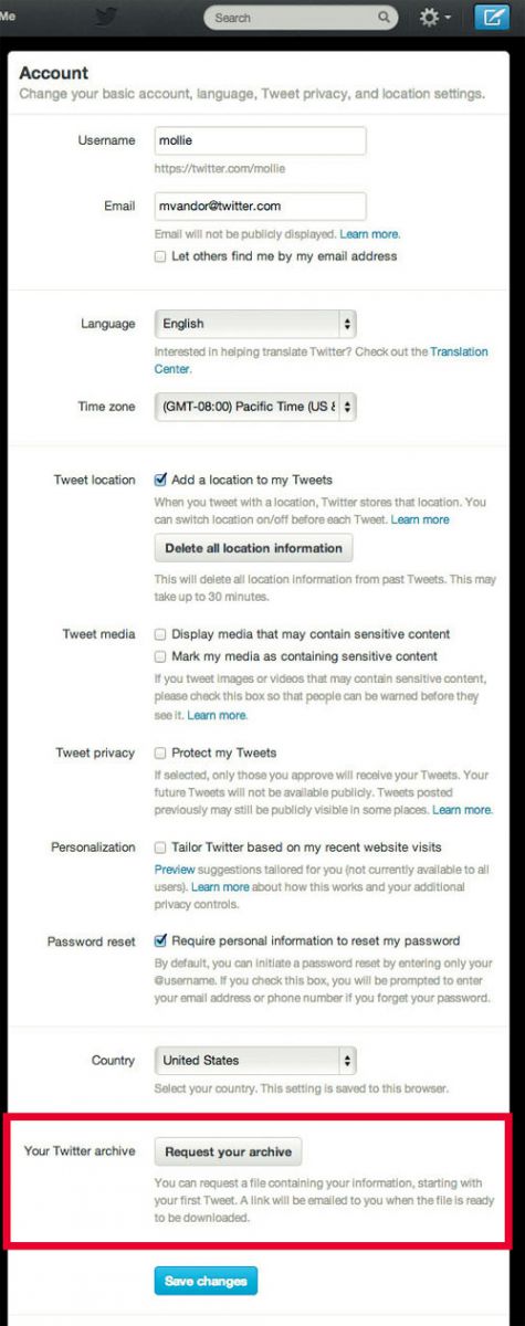 للحصول على الأرشيف منذ بداية اشتراكك يمكنك الذهاب إلى صفحة تعديل الحساب لتجد في نهايتها خاصية طلب الأرشيف فتصلك عبر البريد الإلكتروني رسالة تتضمن الخطوات المطلوبة لتحميل الأرشيف على جهازك واستعراض تغريداتك بحسب الشهر أو البحث بالكلمات المفتاحية والوسوم وأسماء المستخدمين.