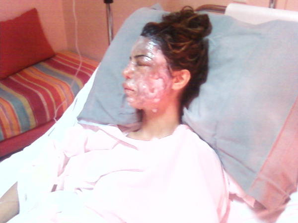 لم يمهلاها أو يتركا لها فرصة الاستنجاد أو الفرار بجلدها، و فاجآها برميها زجاجتي الماء الحارق (الأسيد)، قبل أن يفرا إلى وجهة مجهولة، إحدى هذه الزجاجتين سقطت أرضا وتكسرت، والأخرى أصابتها، والنتيجة حروق من الدرجتين الثالثة والثانية في الوجه والعينين والكتف واليد اليسرى والرجلين واليدين والبطن والصدر.