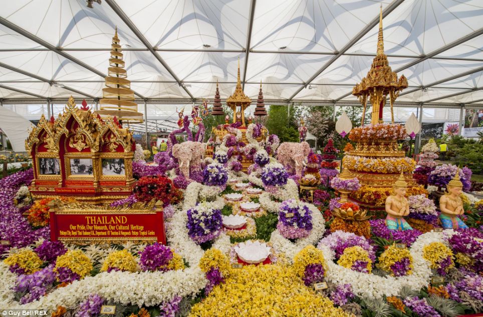 ساهمت سفارة تايلند بتصميم مستوحى من بساتينها يحتوي على 100 ألف زهرة تحيط بمجسمات رمزية.